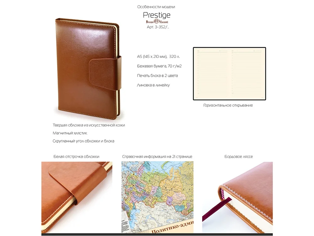 Недатированный ежедневник Prestige от бренда Bruno Visconti - это качественный корпоративный подарок по выгодной цене, произведенный специально под персонализацию. Представлен в универсальном формате А5 и содержит 320 страниц. Не лишенный солидности и респектабельности новый ежедневник Prestige от Bruno Visconti идеально дополняет имидж современных профессионалов. Твердая обложка выполнена из гладкого кожзама, неотличимого от кожи fiore vegetale. Скругленный корешок и уголки обложки в сочетании с магнитным клапаном делают ежедневник Prestige невероятно стильным аксессуаром. Глянцевая поверхность материала акцентирована контрастной белой строчкой вдоль закругленного края. Функциональная деталь - широкий магнитный клапан. Декоративный хлястик надежно фиксирует блок, исключая случайное раскрывание в сумке.