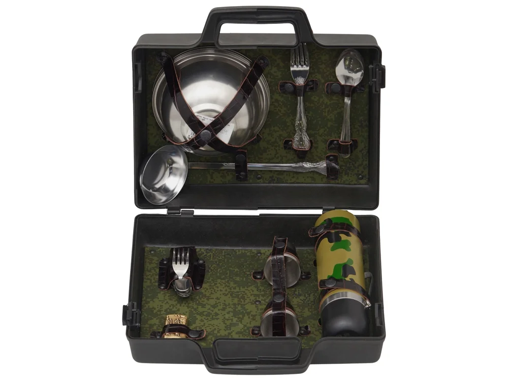 Все элементы набора выполнены из качественной нержавеющей стали, что обеспечивает долговечность и легкость в уходе. Упакованы в пластиковый кейс и надежно закреплены ремешками из натуральной кожи, что обеспечивает удобство транспортировки и сохранность содержимого.