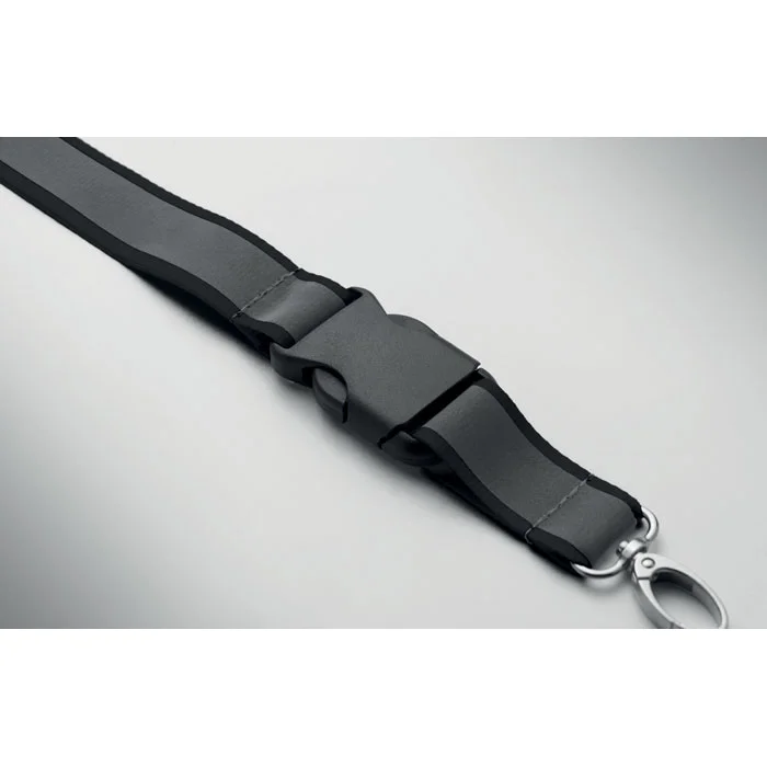Светоотражающий ланьярд из переработанного полиэстера 2,5 см с металлическим крючком, съемной пряжкой из полипропилена и предохранительным защелкивающимся механизмом. Только для рекламных целей.