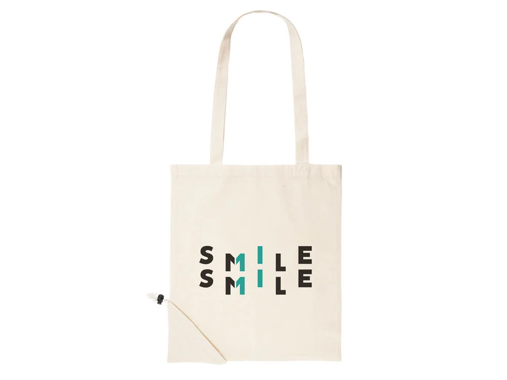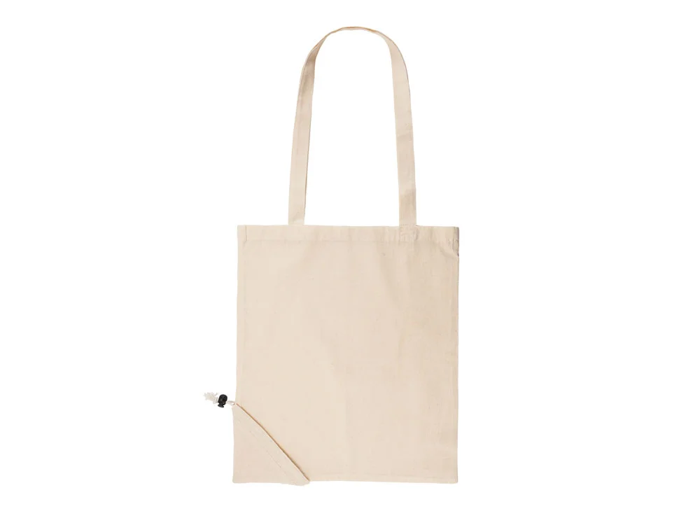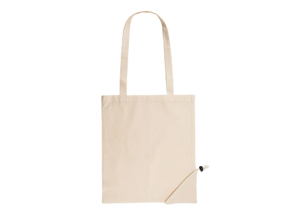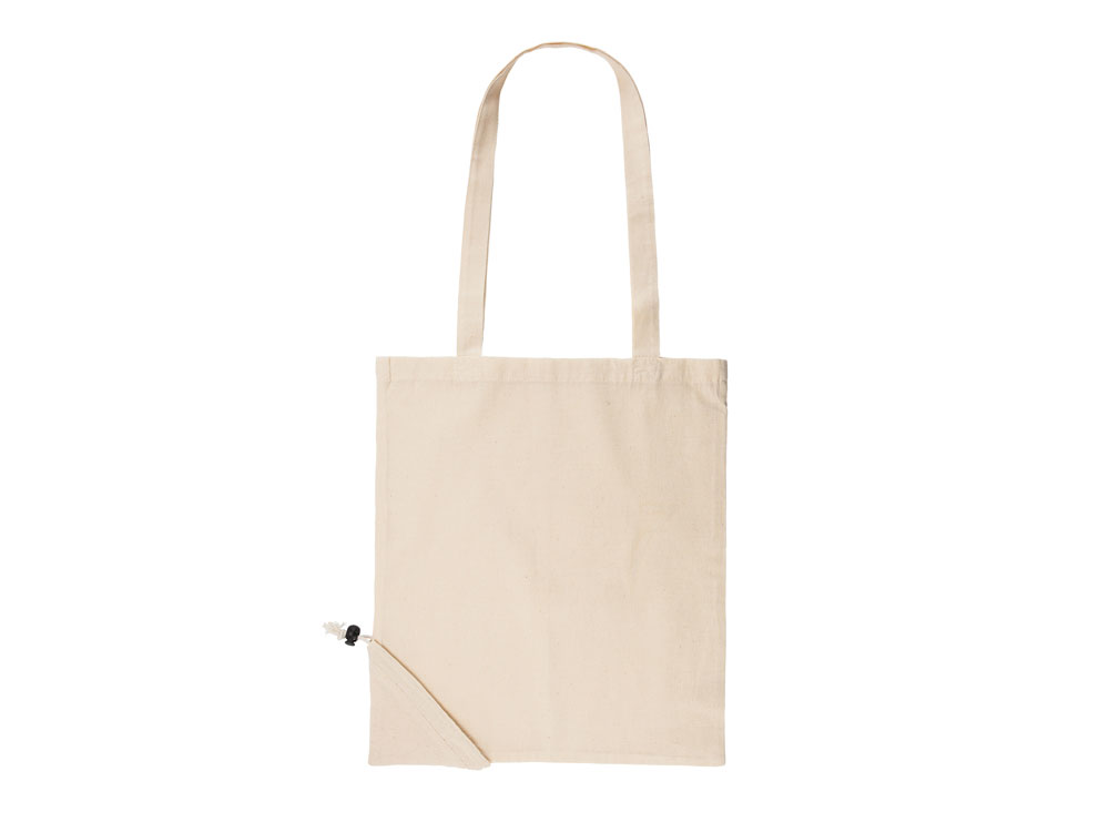 Складная сумка для покупок из 100% хлопка плотностью 105 г/м2 с ручками длиной 70 см и регулируемым складным мешочком на шнурке.
