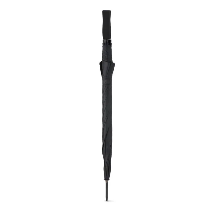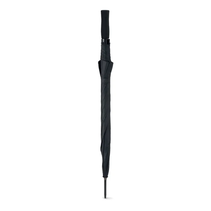 Зонт полуавтомат устойчивый к ветру с черным металлическим стержнем и черной пластиковой ручкой. Длина в сложенном виде 23 см.